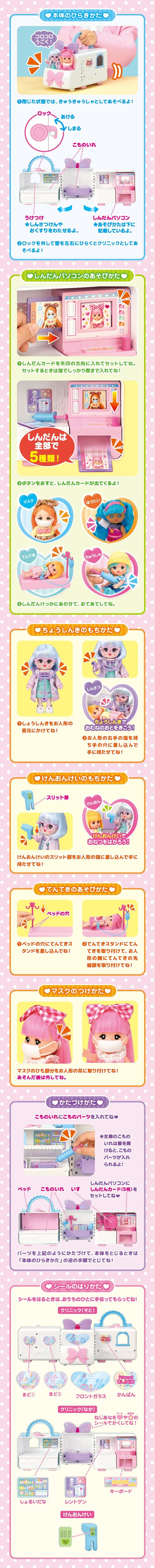 你可以把MELL CHAN和朋友們放在救護車上,四處移動。打開它,它就會變成一間診所!按下診斷電腦上的按鈕,一張診斷卡就會出來。根據診斷結果治療病人。