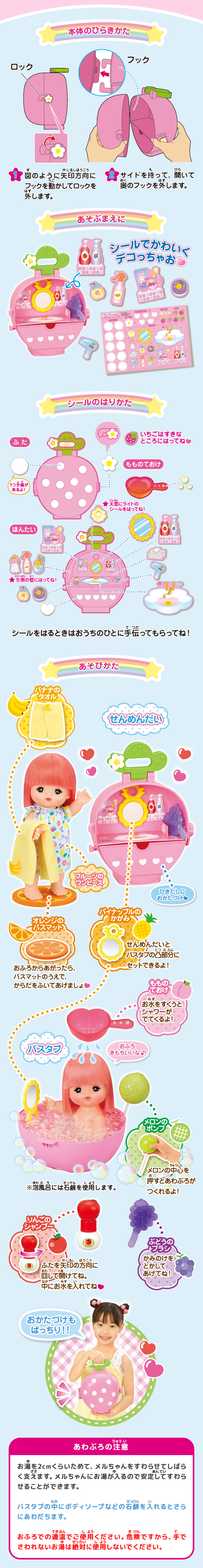來跟咪露一起享受泡澡的樂趣吧!當她進入熱水(36℃以上)時,頭髮顏色會從草莓色變成檸檬色!這款髮色是這套限定的。打開草莓浴盆,它就變成了一個浴缸和洗手台。在浴缸裡加入熱水和沐浴露,按下西瓜造型的按壓泵,就能享受泡泡浴啦!