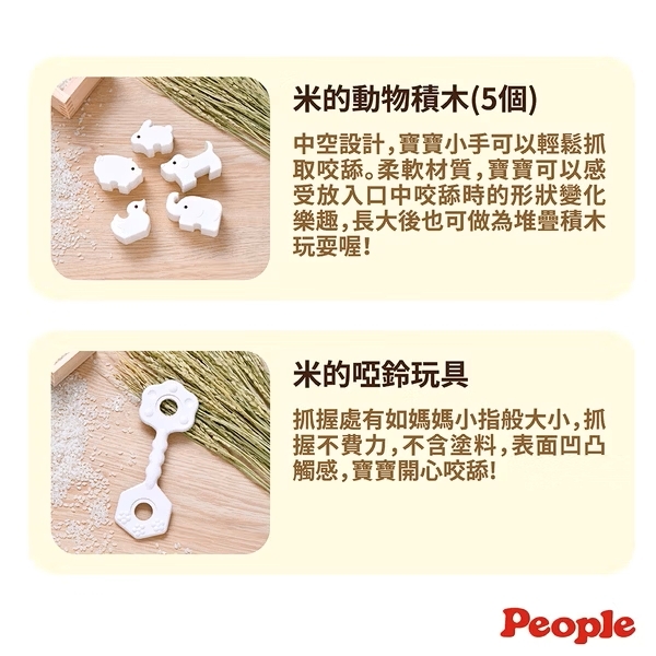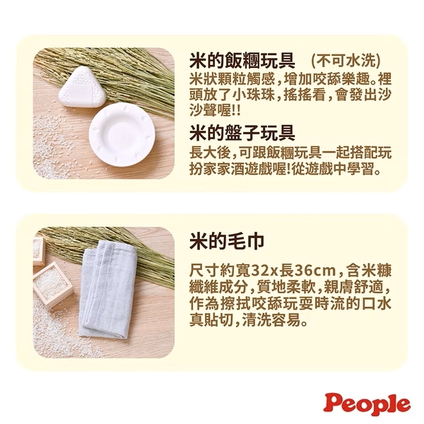 材質: 米的動物積木、米的啞鈴-米、塑膠(PP、TPE);米的盤子、米的飯糰-米、塑膠(PP);米的毛巾-棉99%、嫘縈人造絲1%(米糠纖維)