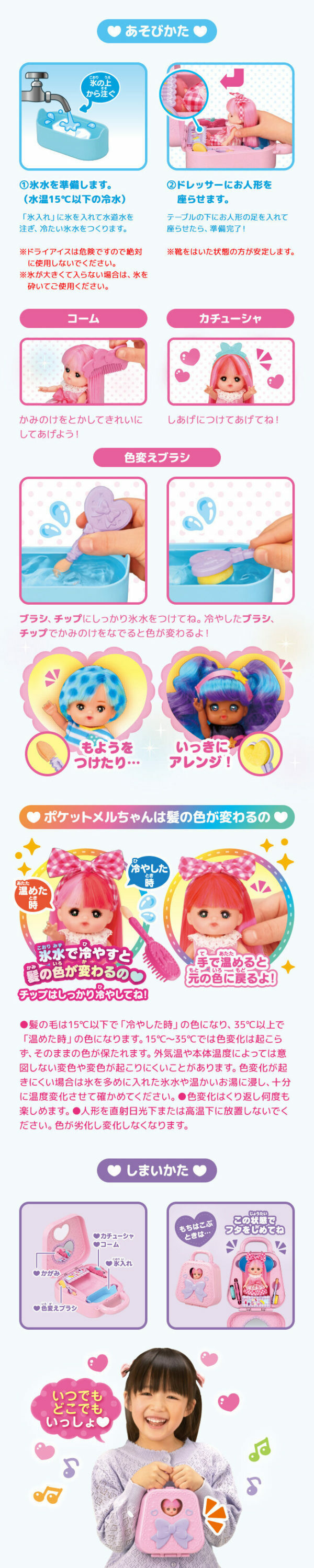 可放Pocket Mell 或朋友鏡前,用冰冷的變色刷在頭髮上變色,梳理頭髮,裝扮起來。它也非常適合攜帶 Pocket Mell。
